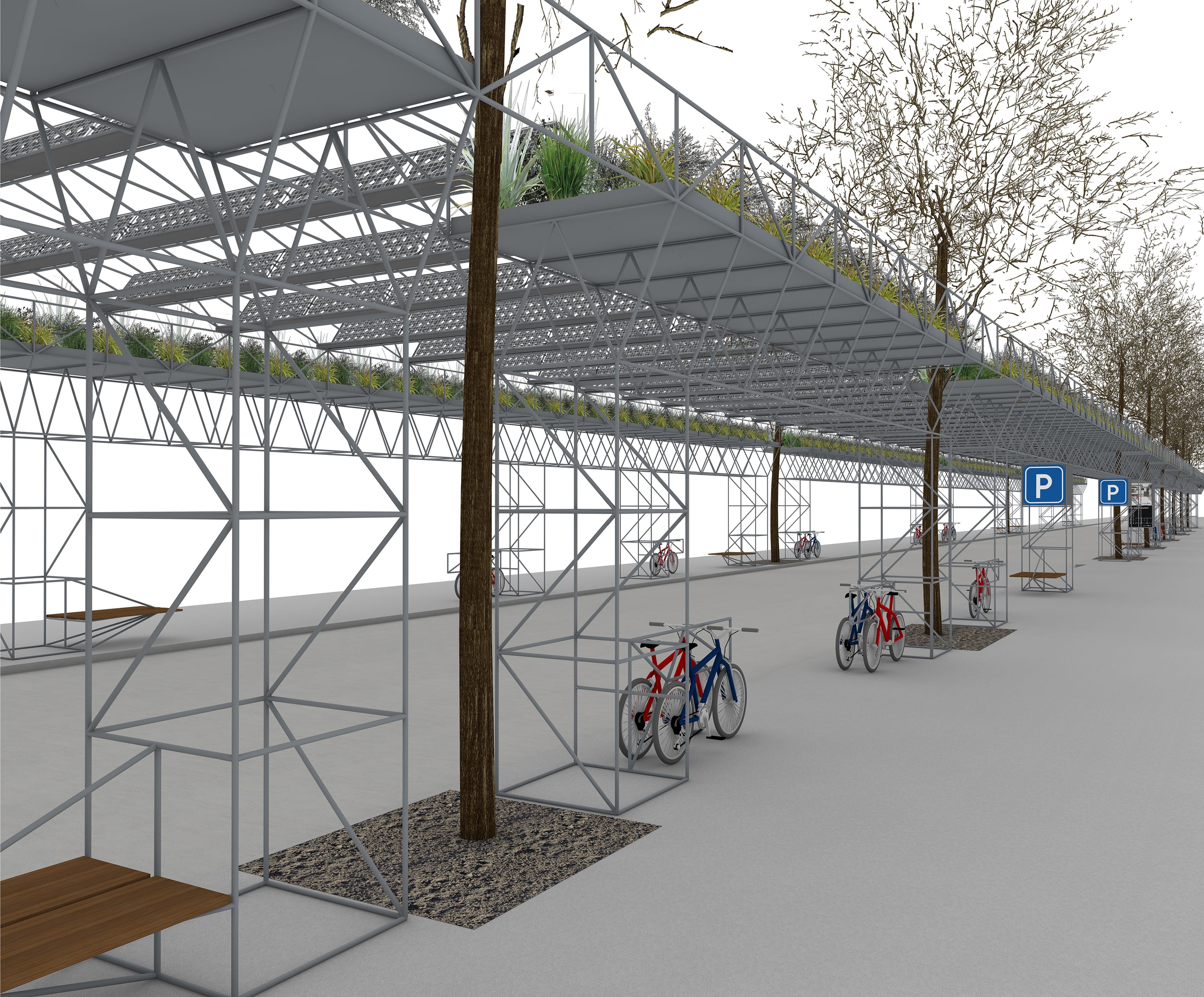 Zwischen zwei parallel zum Straßenverlauf angeordneten Hochbeeten spannen leichte Konstruktionen über die Straße und werden mit Fotovoltaik bestückt. Diese dient der lokalen Energieversorgung: Punktuelle Pufferspeicher geben zeitversetzt Energie ab zum Betrieb der Beleuchtung und versorgen die technischen Installationen, die elektrische Energie benötigen.